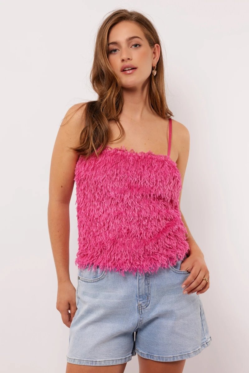 Deze te leuke roze fluffy top is de ultieme keuze voor zomeravonden, feestjes of festivals. De Millicent top combineert fun en comfort: de voorkant heeft een opvallende fluffy finish die er uit ziet als een feestje op zichzelf, terwijl de achterkant gemaakt is van zacht, gesmokte satijn met stretch.