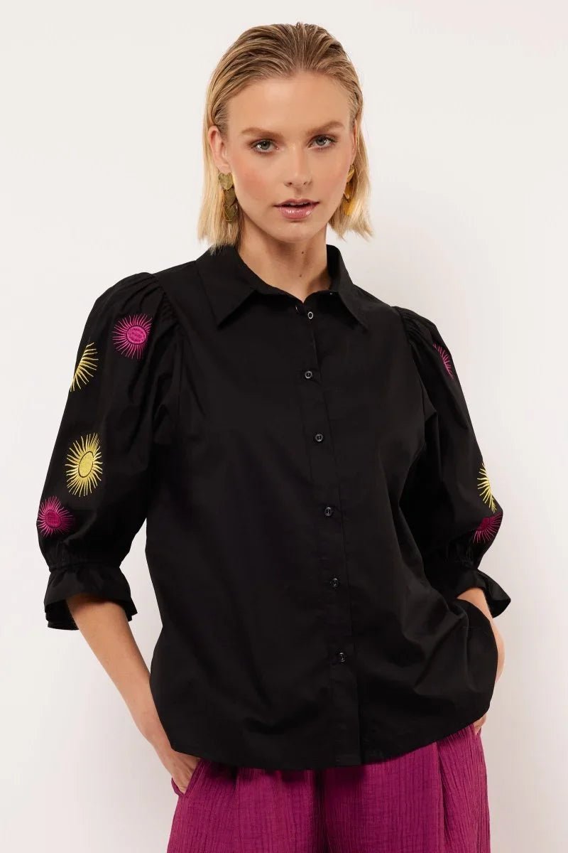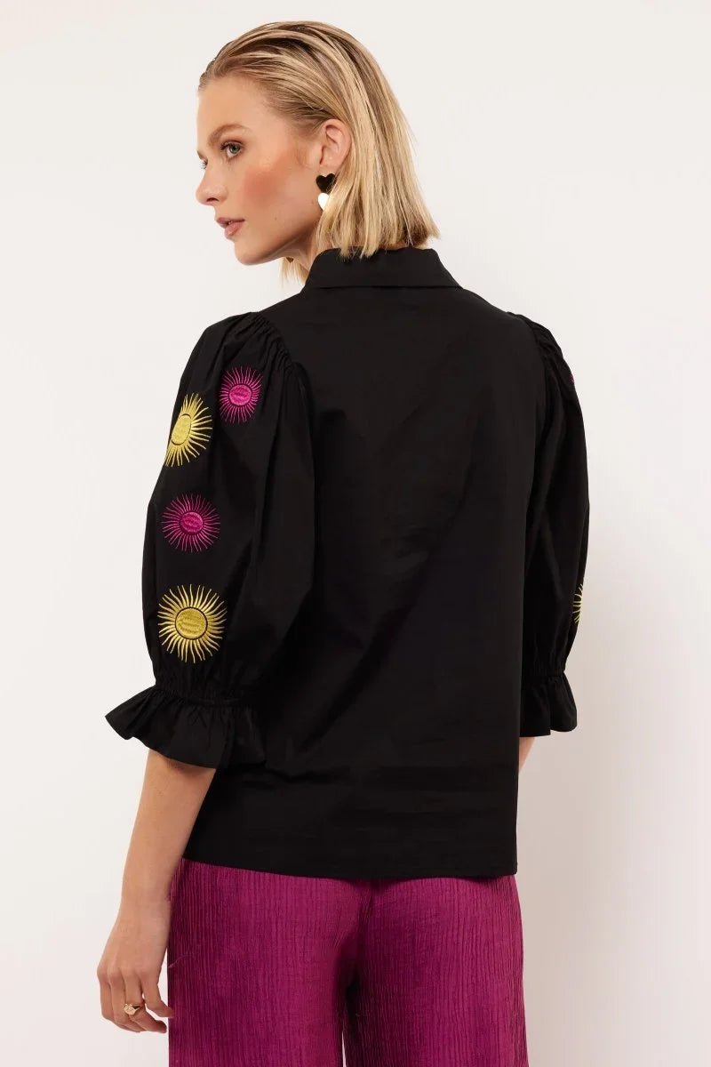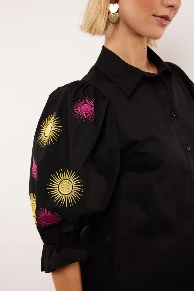 De Marlowe Blouse onderscheidt zich door de opvallende geborduurde zonnestralen in roze en geel, strategisch geplaatst op de volumineuze pofmouwen. Deze speelse details brengen een vleugje vrolijkheid in je outfit, terwijl het strakke zwarte ontwerp zorgt voor een tijdloze en professionele uitstraling. De klassieke knoopsluiting en elastische mouwuiteinden voegen een verfijnde afwerking toe aan het geheel.
