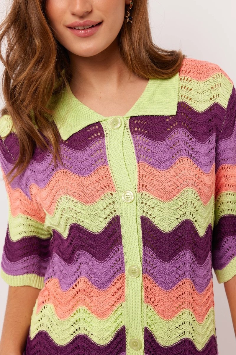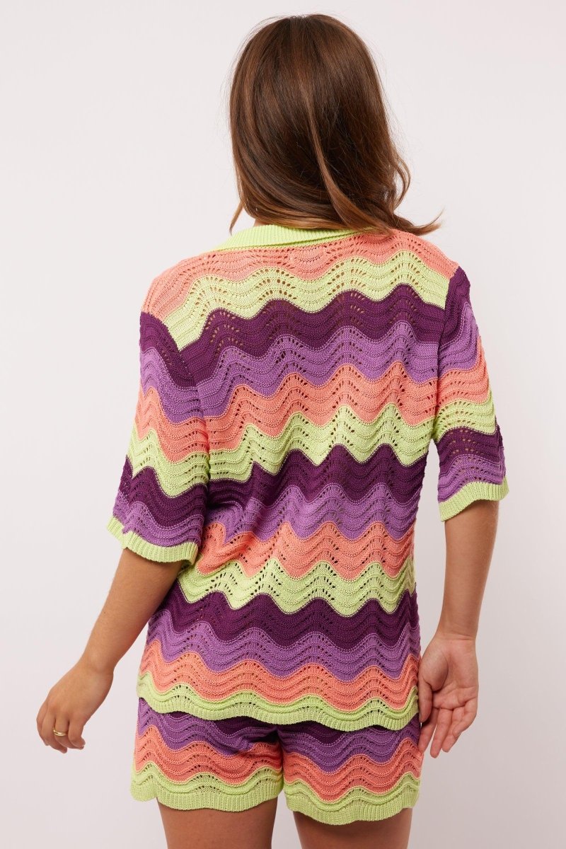 Zin in een outfit die net zo vrolijk is als jij? De Withney blouse van Fluresk is dan dé perfecte match. Deze luchtige blouse met opvallend gehaakt zigzagpatroon in limegroen, perzik, paars en lila brengt je gelijk een zomergevoel. De korte mouwen, losse pasvorm en klassieke knoopsluiting zorgen voor een relaxte vibe die je overal mee naartoe neemt. Voor de ultieme zomerset combineer je de Withney blouse met de bijpassende Rihanna shorts.
