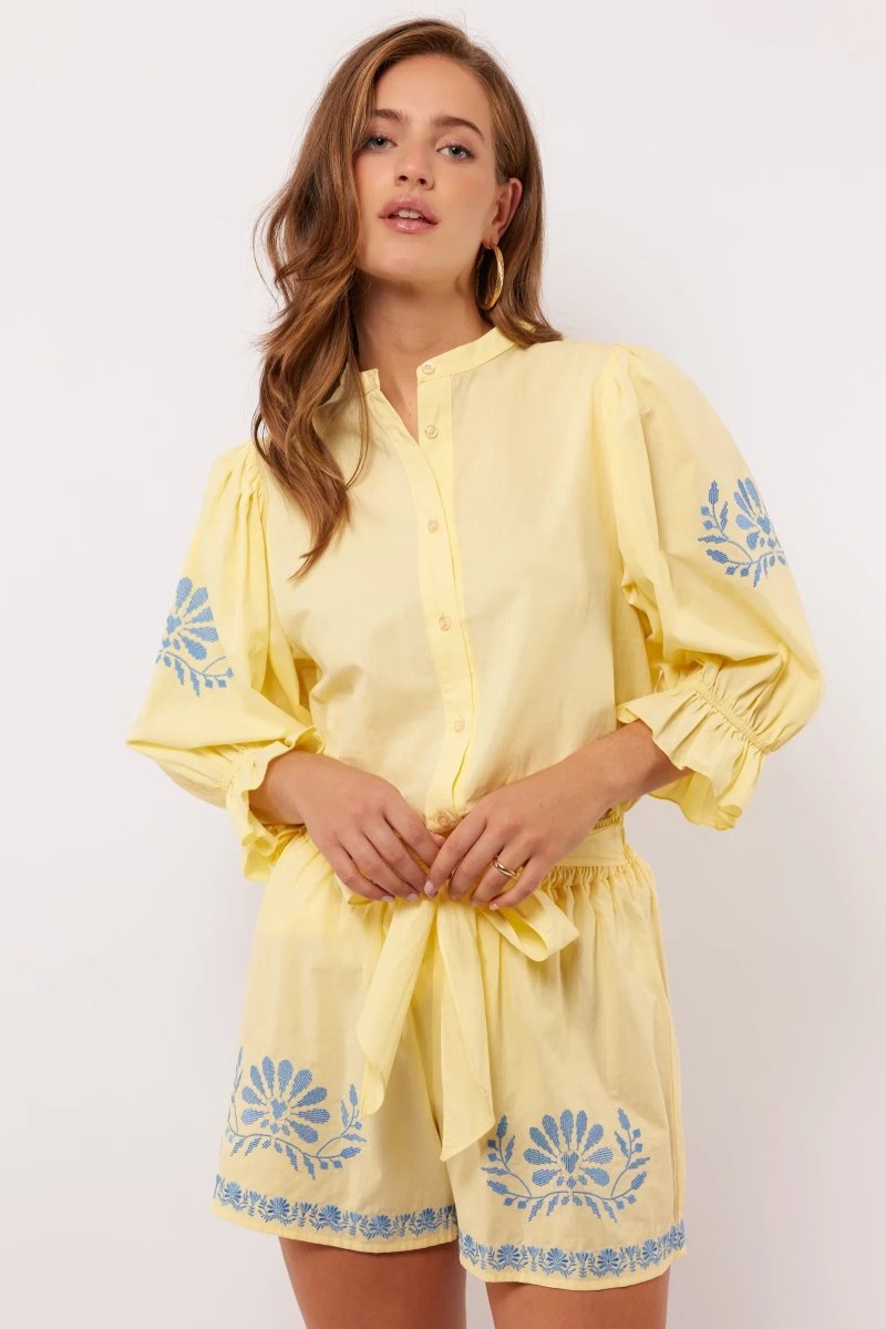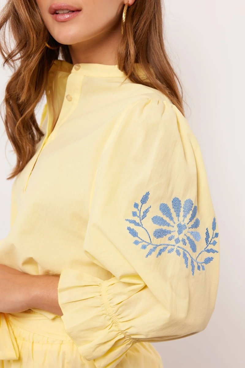 Zonnetje op je huid, ijskoffietje in je hand, deze blouse aan: hello summer vibes! De marlowe blouse van Fluresk is een instant mood booster. Het zachte geel maakt hem super vrolijk, terwijl de blouwe bloemen borduursels zorgen voor een unieke boho touch. De pofmouwen met ruches aan de onderkant maken de blouse helemaal af.