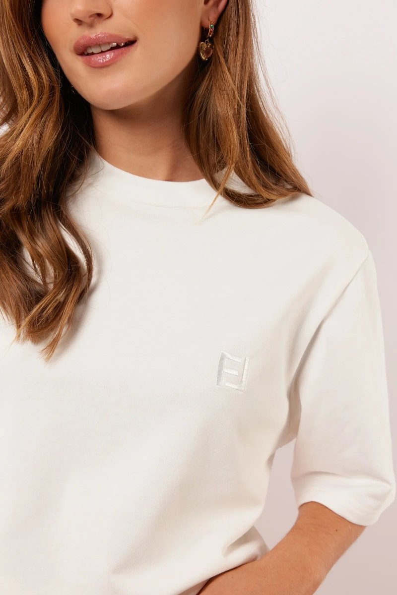 Detail van het witte Fluresk Brix T-shirt met ton-sur-ton geborduurd logo op de borst en subtiele ronde hals.