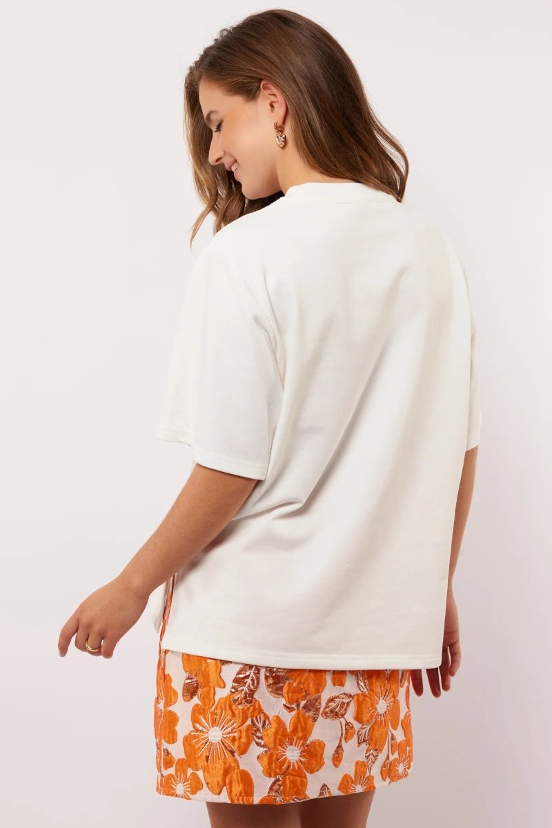 Model draagt het Fluresk Brix T-shirt van achteren, losjes gestyled over een opvallende bloemenrok.