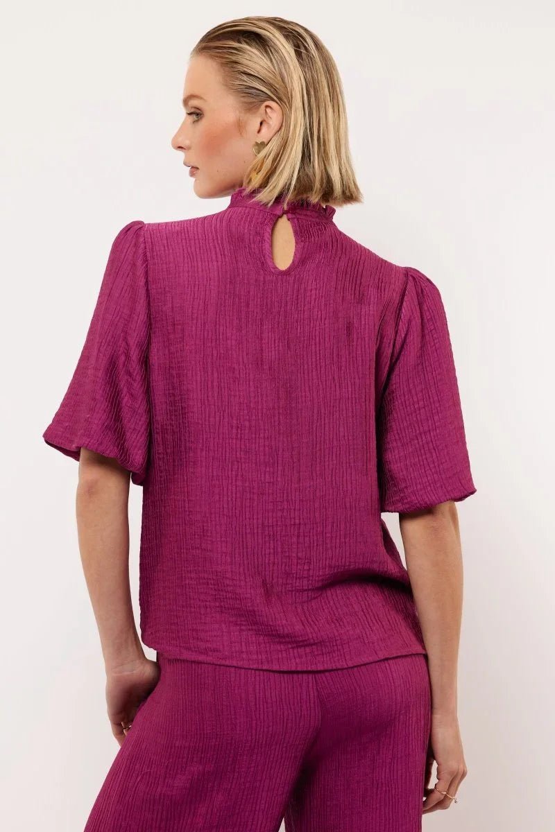 De Geneva Top van Fluresk is een stijlvolle en veelzijdige toevoeging aan je garderobe. Deze prachtige top in de kleur Purple Orchid combineert een verfijnde uitstraling met een comfortabele pasvorm, perfect voor zowel casual als formele gelegenheden. Gemaakt van een zachte, luchtige stof is de Geneva Top ideaal voor elk seizoen. Wat deze top uniek maakt, zijn de subtiele pofmouwen en de hoge hals met speelse ruches, die een elegante en vrouwelijke uitstraling geven. De achterzijde heeft een charmant knoopdetail bij de hals, wat zorgt voor een verfijnde afwerking. De rijke paarse tint geeft deze top een chique en tijdloze uitstraling, ideaal voor een moderne en zelfverzekerde look.