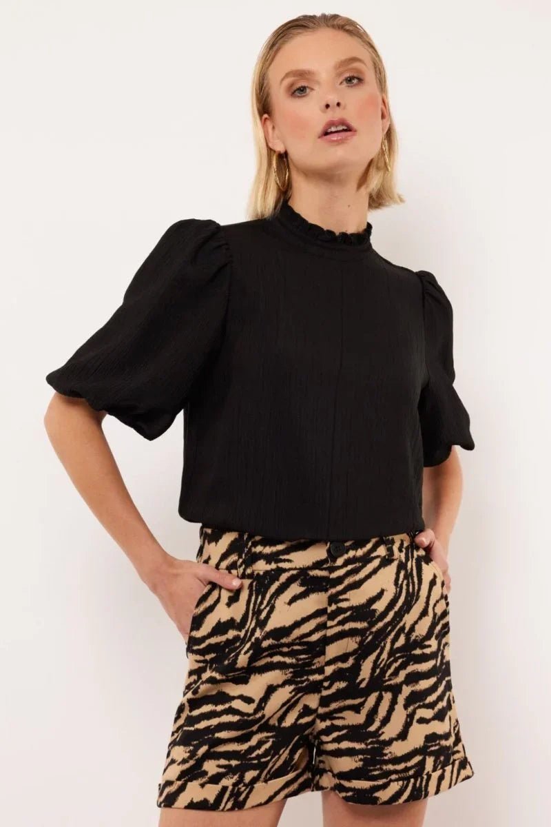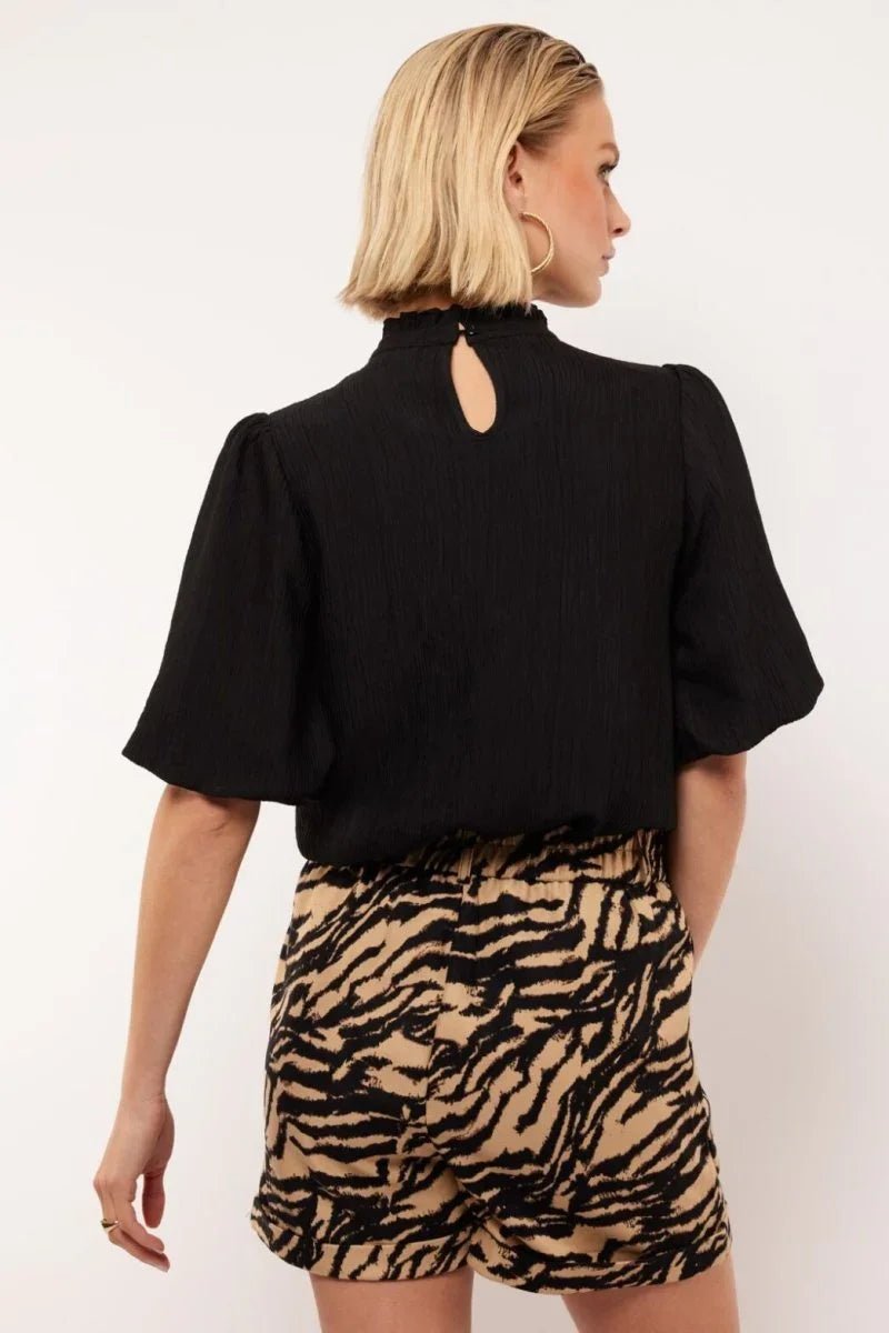 De Geneva Top van Fluresk in de kleur zwart is een elegante zwarte blouse met een hoge hals, subtiele ruches en korte pofmouwen. Dankzij de luxueuze crinkle textuur en de vrouwelijke pasvorm straalt deze top zowel stijl als comfort uit. Voor een complete en moeiteloos chique look draag je hem als co-ord set met de Leslie pants.