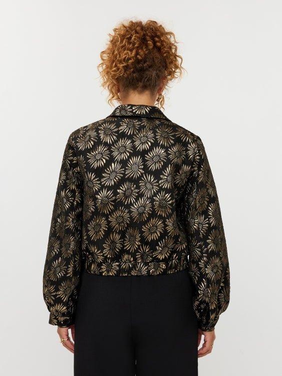 Het Floria jacket van Ydence is een zwart jasje met opvallende gouden bloemenprint. Helemaal leuk om je outfit net wat op te spicen. Dit jasje voor dames is een kort model, heeft een klassieke kraag en knoopsluitingen. De gouden bloemenprint heeft een glanzende afwerking, wat een chique vibe geeft.