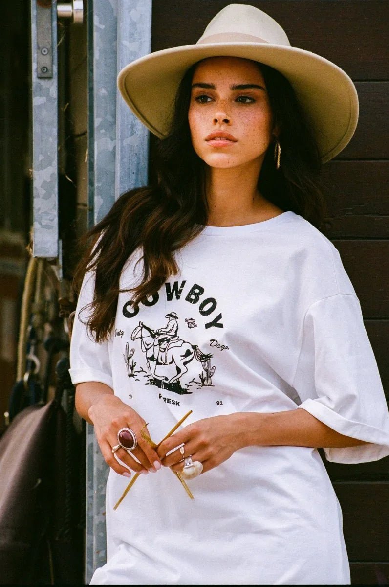 Stap in de wereld van Western vibes met het Marin T-Shirt van Fluresk! Dit oversized T-shirt heeft een stoere cowboyprint en een casual, relaxte pasvorm die perfect is voor een nonchalante, maar trendy look. Het zachte katoen zorgt voor ultiem comfort en ademend vermogen, waardoor je dit shirt het hele jaar door kunt dragen.