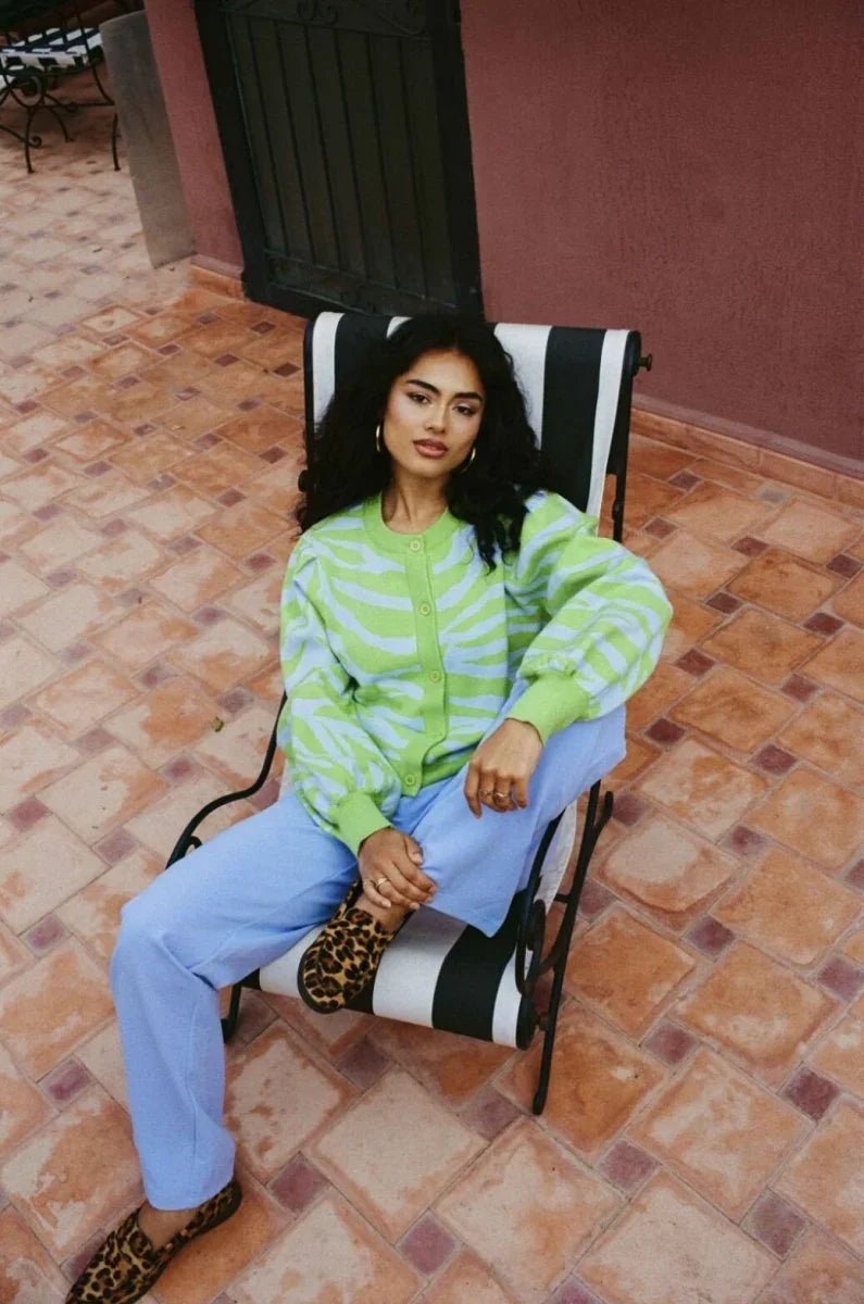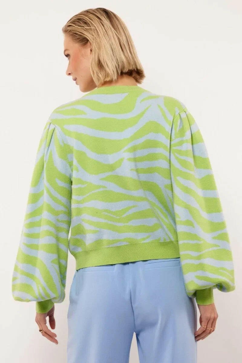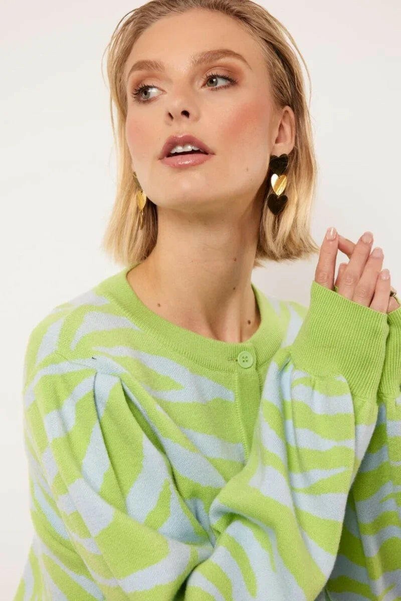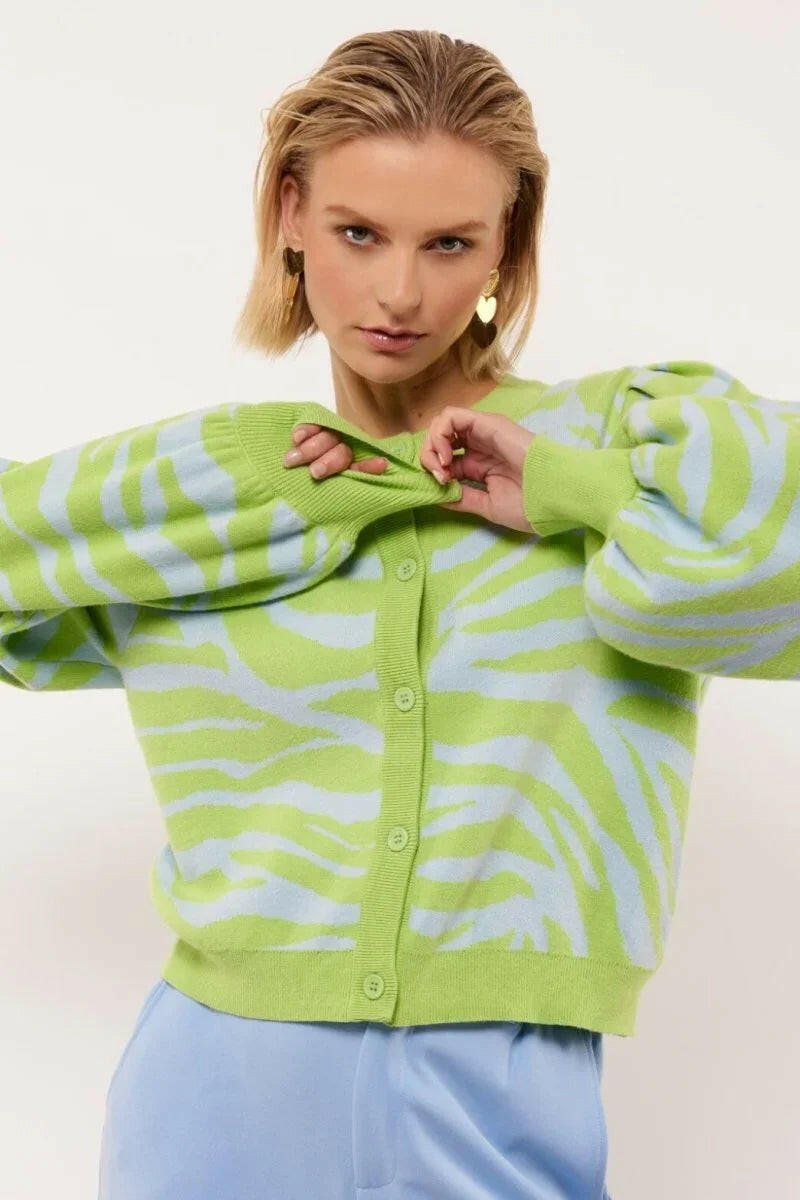 De Salix Cardigan van Fluresk is een echte eyecatcher. Dit gebreide vest met een opvallend zebra-patroon in frisse groene en blauwe tinten geeft je look een trendy en speelse touch. Dankzij de oversized pasvorm en ballonmouwen straalt het niet alleen stijl uit, maar zit het ook heerlijk comfortabel.