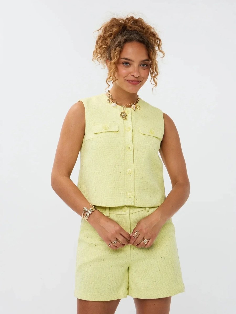 Met de klassieke knoopsluiting, decoratieve borstzakjes de rechte pasvorm geeft het Amanda gilet je outfit een klassieke touch. Combineer hem met de bijpassende short voor de perfecte zomerse two-piece look. Ook staat dit botergele gilet heel leuk op een denim broek. Of je nu de stad in gaat of een (bottemless) brunch op de planning hebt, dit gilet maakt jouw outfit compleet!